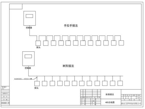 總線制的儀表主要有4條主線即:2根電源線+2根信號線,信號為RS485信號,把所有探測器全部接到報(bào)警控制器上面,可燃?xì)怏w探測器為編碼型。按端子標(biāo)識接線即可。注意:如果距離較遠(yuǎn)可根據(jù)現(xiàn)場情況適當(dāng)安裝24V電源。布線時盡量遠(yuǎn)離有強(qiáng)電等干擾的地方。